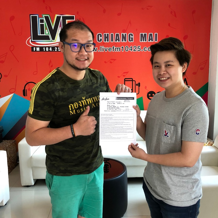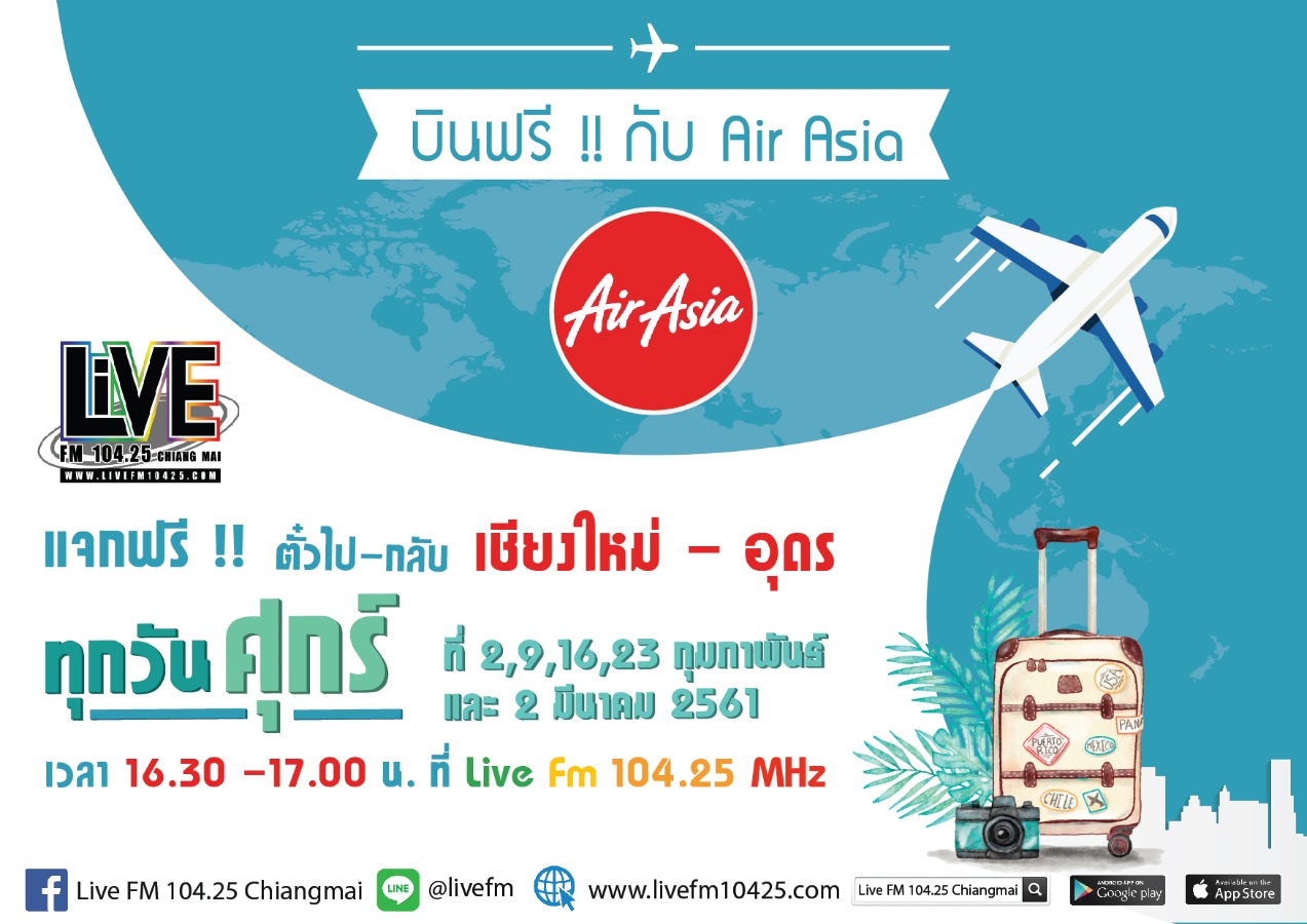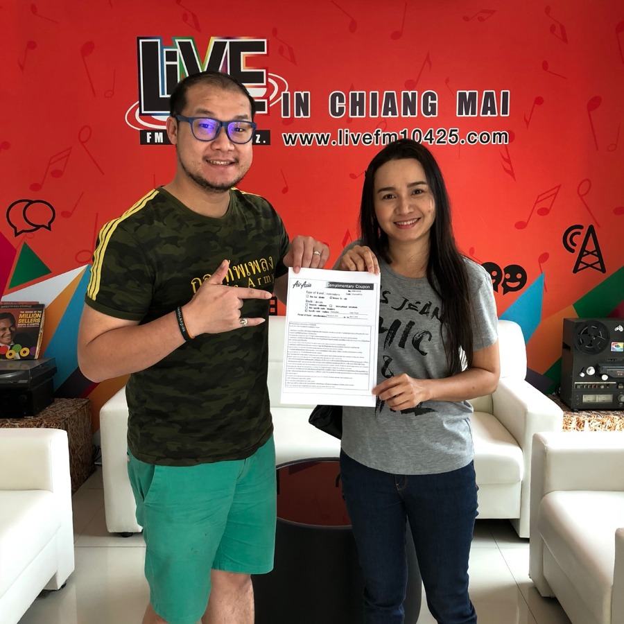 ผู้โชคดีทีไ่ด้ร่วมสนุกกับ Air Asia แวะมารับ E-Ticket บินฟรีเชียงใหม่ - อุดรธานี 2 ที่นั่ง สามารถติดตามรายละเอียดเที่ยวบินเชียงใหม่ - อุดรธานี กับลำใหม่ เครื่องใหม่ และร่วมสนุกกับ Air Asia ลุ้นตั๋วเครื่องบินได้ทุกวันศุกร์ ที่นี่ Live FM 104.25 MHz เวลา 16.30-17.00 น.