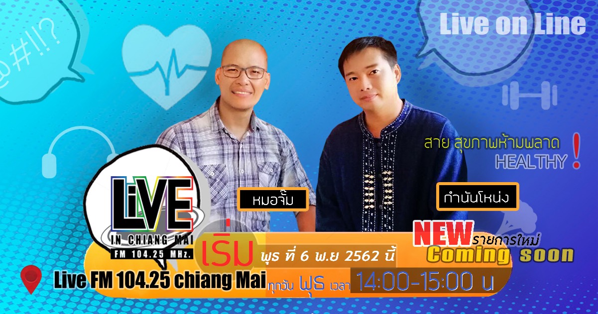Live FM 104.25 เชียงใหม่ คลอดรายการน้องใหม่ เอาใจสายสุขภาพ เพราะอยากให้ชาวไลฟ์มีสุขภาพที่ดีและได้รับข้อมูลที่เป็นประโยชน์มากขึ้น ติดตามรายการใหม่ "Hot Line สายสุขภาพ" โดยคุณหมอจั๊ม และกำนันโหน่ง ทุกวันพุธ เวลา 14.00-15.00 น. เริ่มพุธ ที่ 6 พ.ย.นี้ เป็นต้นไป ฟังสดและฟังออนไลน์พร้อมกันทั่วประเทศทุกช่องทางของไลฟ์เอฟเอ็ม แล้วพบกันจ้า