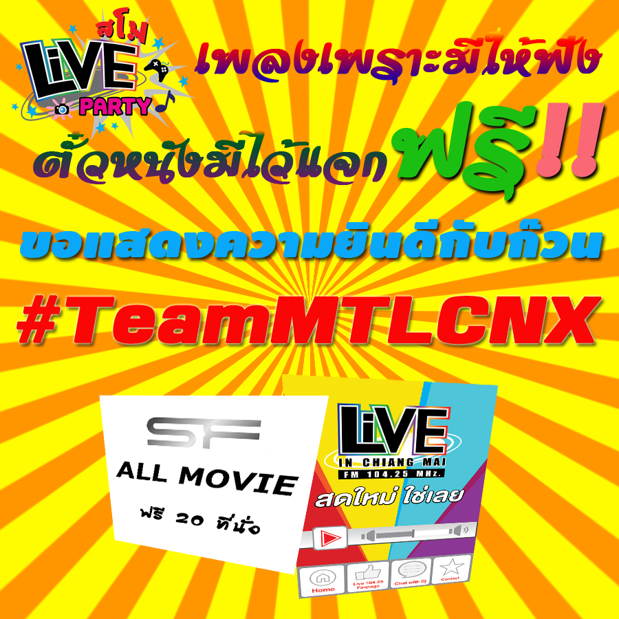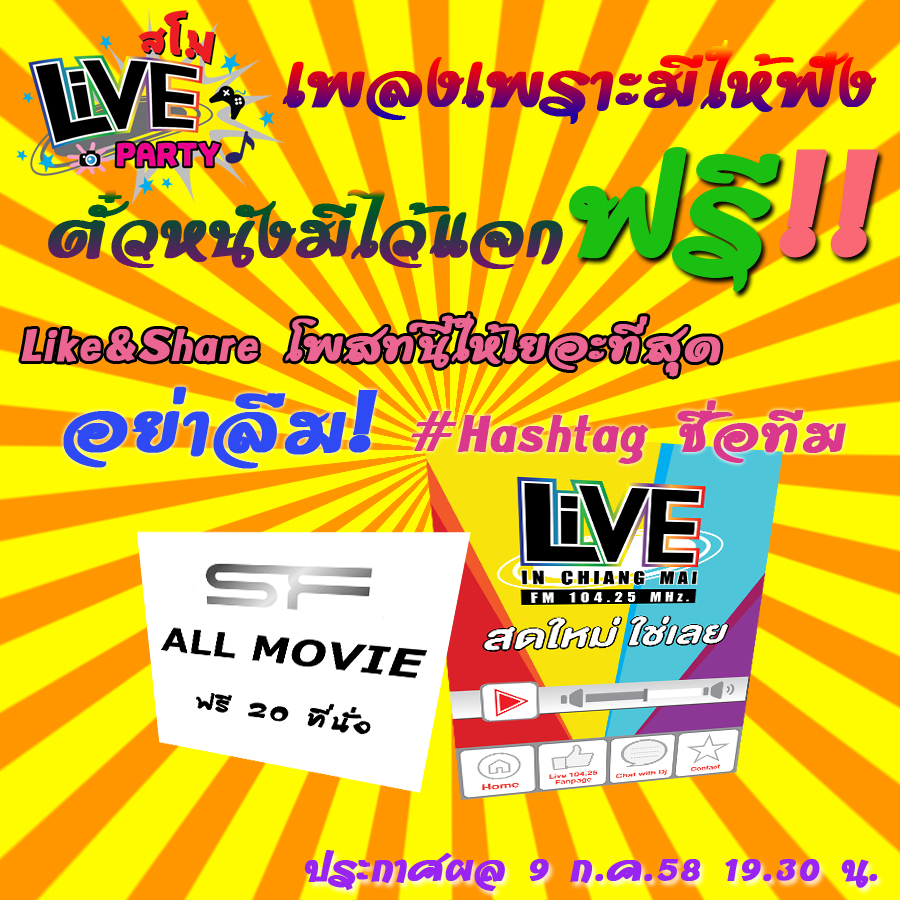กิจกรรมฟินๆ สำหรับคนชอบดูหนัง ฟังเพลง เอสเอฟซีเนม่า ร่วมกับ Live In Chiangmai 104.25 FM ฉลองเพจไลฟ์ครบสองพันไลค์ แจกบัตรชมภาพยนตร์...