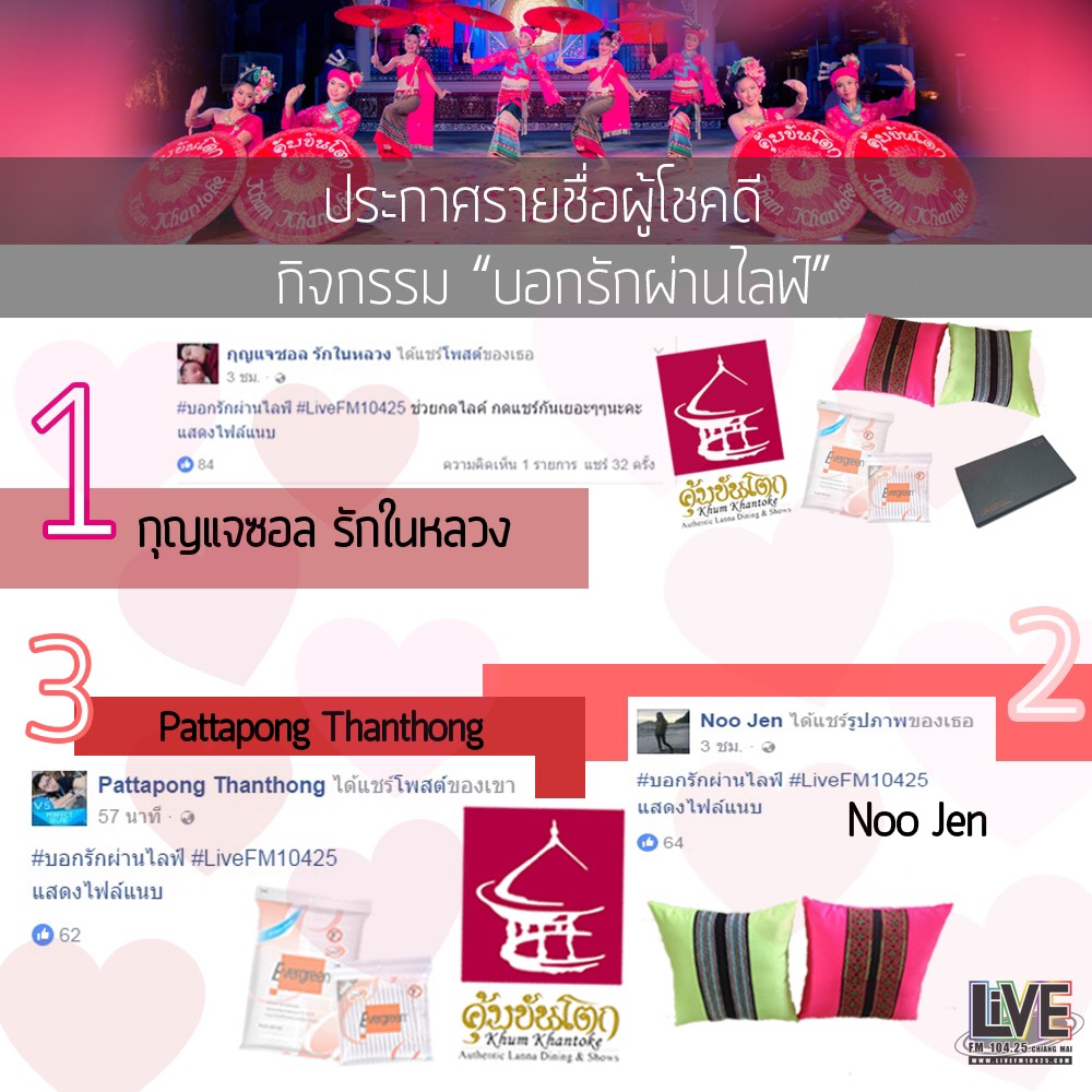ประกาศรายชื่อชาวไลฟ์ผู้โชคดีที่ร่วมสนุกกิจกรรมแจกบัตร North Fest The Oasis 2017 จำนวน 5 รางวัลๆ ละ 2 ใบ ผู้โชคดีชาวไลฟ์ ได้แก่ 1.K...