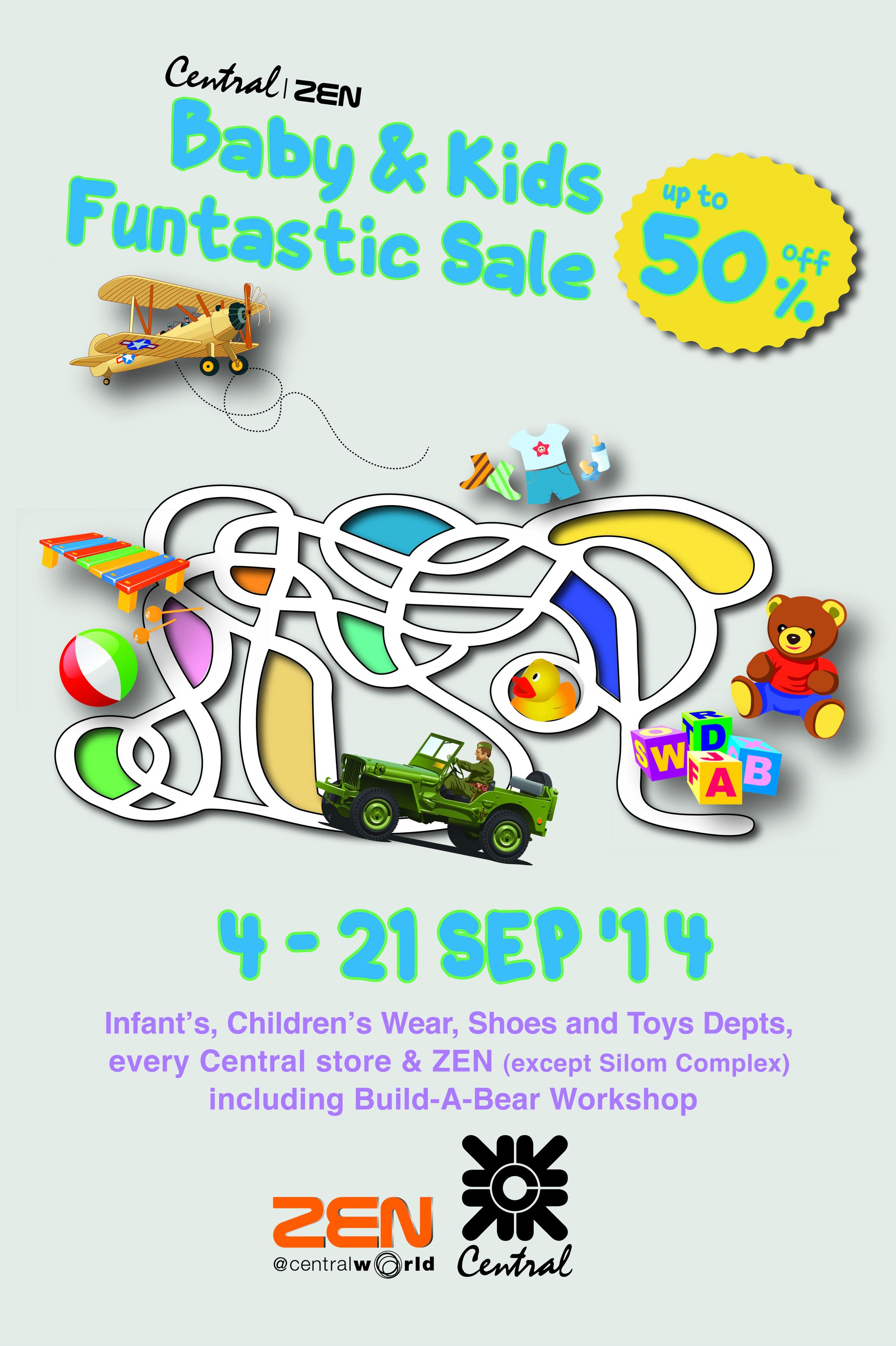 ห้างเซ็นทรัล/เซน จัดรายการ “Central / ZEN Baby Kids Funtastic Sale II 2014” เพิ่มความสุขให้ลูกน้อยด้วย เสื้อผ้า, เฟอร์นิเจอร์, รองเท้า และของเล่นสำหรับเด็ก เคาน์เตอร์ปกติ ลดสูงสุด 20% ,สินค้าคุณภาพ ลดสูงสุด 50% ช้อปฯ ผ่านบัตร The 1 Card ลดเพิ่ม 12.5% ด้วยคะแนนเท่ายอดซื้อ พร้อมรับคะแนนสะสมเพิ่มสูงสุด 10 เท่า วันนี้ - 21 ก.ย. 57 ที่แผนกเสื้อผ้าเด็กอ่อน ห้างเซ็นทรัล กาดสวนแก้ว และห้างเซ็นทรัล เฟสติวัล