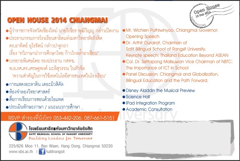 โรงเรียนสาธิตแห่งมหาวิทยาลัยรังสิต ได้จัดงาน Open house 2014 Chiangmai ที่โรงแรมแชงกรีล่า เชียงใหม่ ชั้น1 ในวันเสาร์ที่15กุมภาพันธ์ 2557 ตั้งแต่เวลา 10.00-14.00 น.