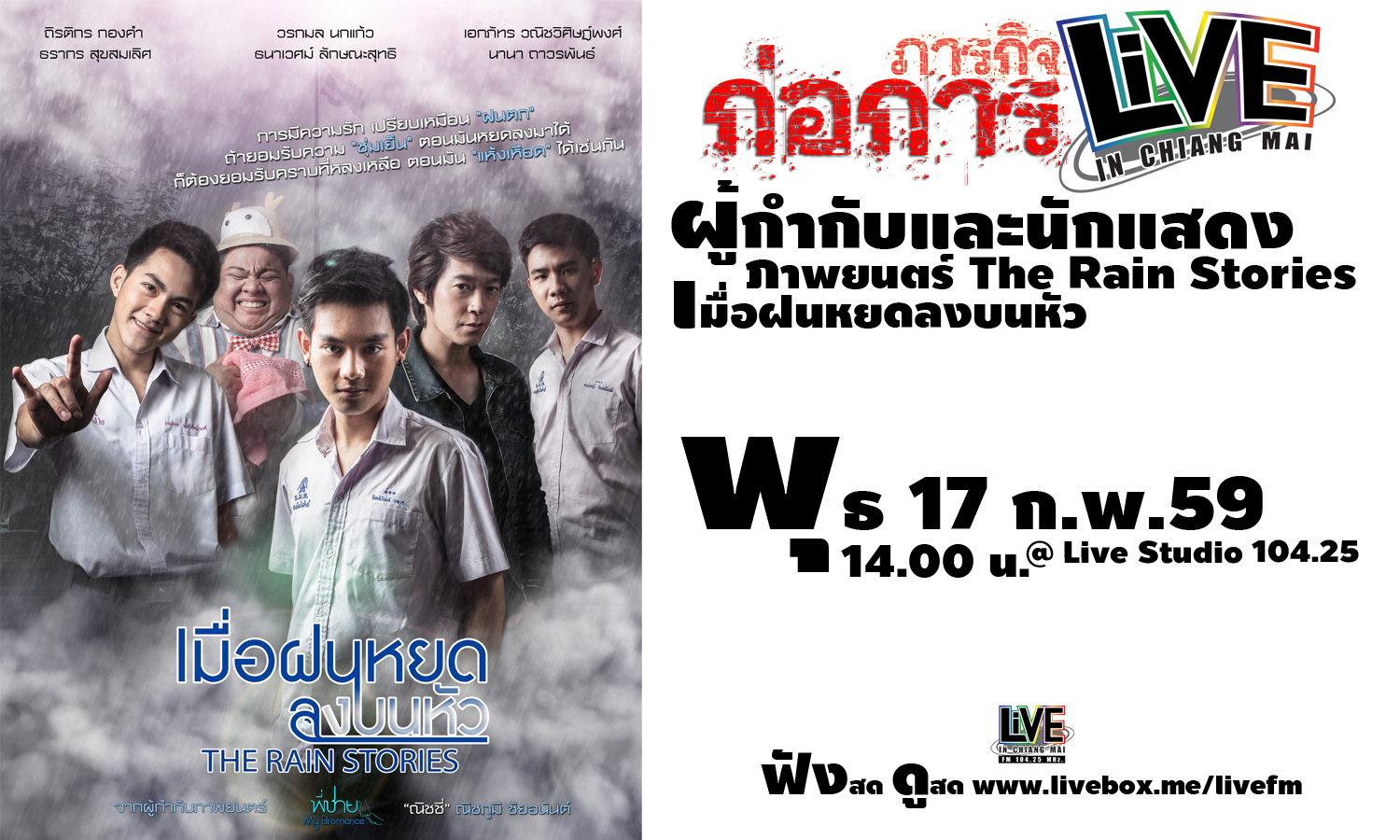 เมื่อวันพุธ ที่ 17 ก.พ.59 ที่ผ่านมา ภารกิจก่อการ Live เปิดสตูดิโอต้อนรับ ผู้กำกับภาพยนตร์เรื่อง "เมื่อฝนหยดลงบนหัว (The Rain Stori...