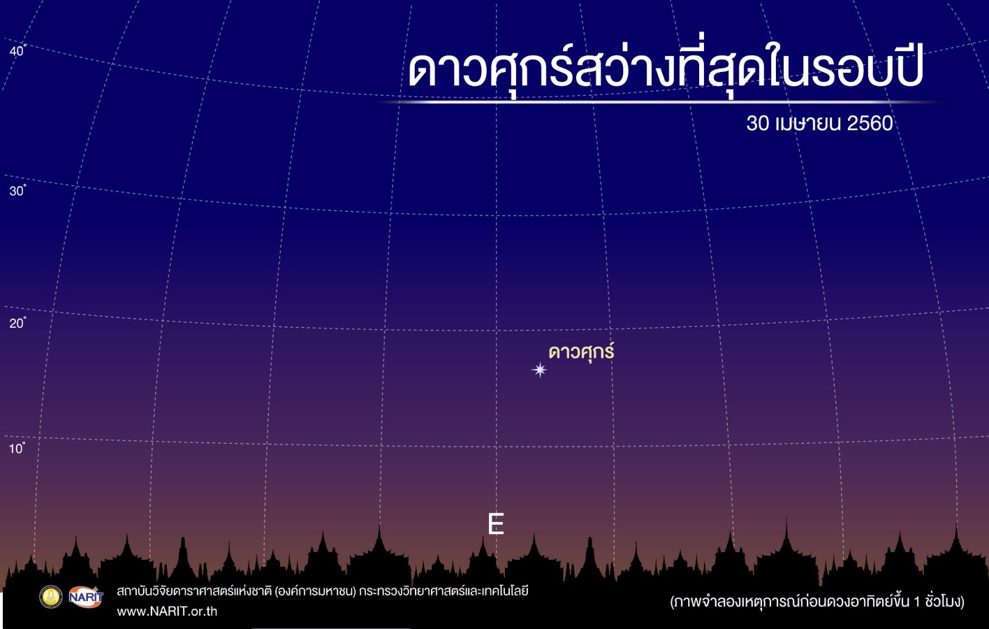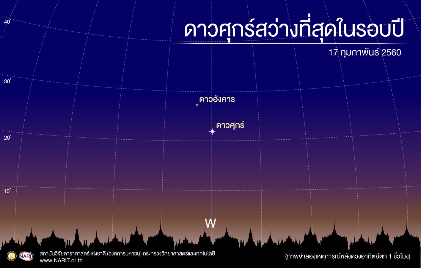 สถาบันวิจัยดาราศาสตร์แห่งชาติ (องค์การมหาชน) กระทรวงวิทยาศาสตร์และเทคโนโลยี ชวนชมดาวศุกร์สว่างในรอบปี ช่วงค่ำ 17 ก.พ. เวลาประมาณ 18.30 - 20.30 น. ทางทิศตะวันตก และเช้ามืด 30 เม.ย. เวลาประมาณ 04.00 - 06.00 น. ทางทิศตะวันออก มองเห็นด้วยตาเปล่า สว่างชัดทั่วไทย ติดตามรายละเอียดเพิ่มเติมได้ที่ Facebook : NARITpage