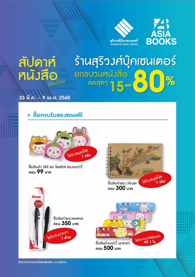 ร้านสุริวงศ์บุ๊คเซนเตอร์ ร้านหนังสือของคนเชียงใหม่ จัดสัปดาห์หนังสือเชียงใหม่ ครั้งที่ 1 ตั้งแต่วันที่ 23 มีนาคม - 9 เมษายน 2560 ยกขบวนหนังสือมากถึง 100 สำนักพิมพ์ เอาใจนักอ่านในจังหวัดเชียงใหม่และภาคเหนือ จัดโปรโมชั่นลดกันแบบสุดๆ ตั้งแต่ 15-80% พร้อมแผนกเครื่องเขียน จัดโปรโมชั่นบุฟเฟ่ต์ 1 แถม 1 และช้อปครบตามเงื่อนไข รับของแถมกลับบ้านกันอีก ติดตามรายละเอียดเพิ่มเติมได้ที่ Facebook สุริวงศ์บุ๊คเซนเตอร์