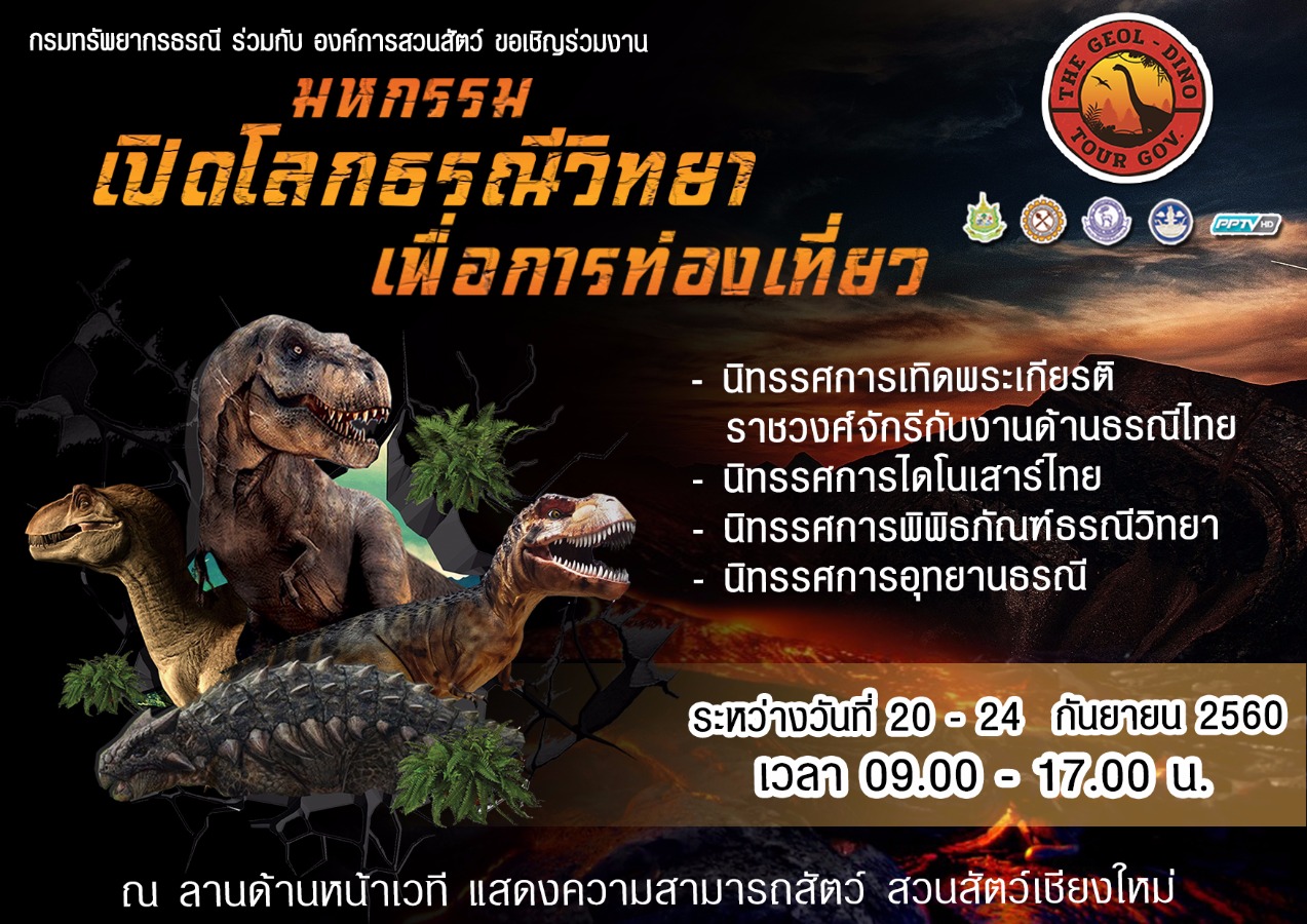 กรมทรัพยากรธรณี ร่วมกับองค์การสวนสัตว์ เชิญร่วมงานมหกรรมเปิดโลกธรณีวิทยาเพื่อการท่องเที่ยว ครั้งที่ 2 พบนิทรรศการและกิจกรรมเพื่อน้องๆ มากมาย อาทิ นิทรรศการเทิดพระเกียรติราชวงศ์จักรีกับงานด้านธรณีวิทยา, นิทรรศการไดโนเสาร์ไทย, นิทรรศการพิพิธภัณฑ์ธรณีวิทยา, นิทรรศการอุทยานธรณี ณ ลานด้านหน้าเวทีแสดงความสามารถสัตว์ สวนสัตว์เชียงใหม่ ระหว่างวันที่ 20-24 กันยายน 2560 เวลา 09.00-17.00 น. ติดตามข่าวสารเพิ่มเติมที่ Facebook : เปิดโลกธรณีวิทยาเพื่อการท่องเที่ยว