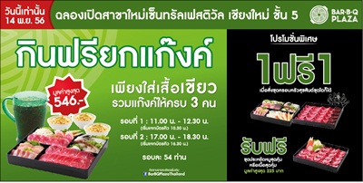 บริษัท เดอะบาร์บีคิวพลาซ่า จำกัดฉลองเปิดสาขา 2 ในเชียงใหม่ เชิญชาวเชียงใหม่และจังหวัดใกล้เคียงร่วมฉลองเปิดร้านบาร์บีคิวพลาซ่าสาขาใหม่ ณ บริเวณชั้น 5 ของห้างสรรพสินค้าเซ็นทรัลเฟสติวัล เชียงใหม่ โดยบริษัทฯ ได้เตรียมกิจกรรมพิเศษ “กินฟรียกแก๊ง”ซึ่งเป็นกิจกรรมพิเศษที่จัดขึ้นเพียงแค่ 1 วัน 1 สาขาเท่านั้น คือ เฉพาะในวันที่ 14 พฤศจิกายน 2556 ที่สาขาเซ็นทรัลเฟสติวัล เชียงใหม่ เท่านั้น โดยจะจัดกิจกรรมดังกล่าวแค่เพียง 2 รอบ คือรอบ 11:00 – 12:30 น. และ 17:00 – 18:30 น.ทั้งนี้ ผู้ที่จะได้รับสิทธิ์เข้าร่วมกิจกรรมฯ ทุกท่านจะต้องจับกลุ่มใส่เสื้อสีเขียว กลุ่มละ 3 ท่าน เพื่อเข้าคิวรอบริเวณหน้าร้านบาร์บีคิวพลาซ่าสาขาดังกล่าว และเลือกรับสิทธิ์กินฟรีชุดพิเศษหมูเริงร่า หรือ ชุดพิเศษเนื้อฮาเฮจำนวน 1 ชุดอย่างใดอย่างหนึ่ง พร้อมข้าวผัดกระเทียม 3 ถ้วยและเครื่องดื่มโค้กอีก 1 เหยือก รวมมูลค่าต่อโต๊ะสูงสุดถึง 546 บาท โดยรับสิทธิ์กินฟรีจำกัดจำนวนที่ 54 ท่านต่อรอบเท่านั้น และโปรโมชั่นแบบโดนใจอีกมากมายเพื่อมอบให้แก่ลูกค้าคนพิเศษ เฉพาะสำหรับสาขาใหม่ในวันที่ 14 พฤศจิกายน 2556 นี้เท่านั้น