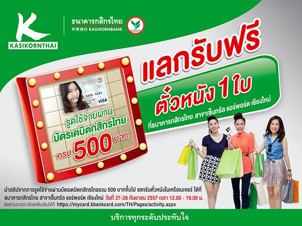 มีข่าวดี เอาใจคอหนังมาบอกจ้า ! รูดใช้จ่ายผ่านบัตรเดบิตกสิกรไทย ครบ 500 บาท แลกรับฟรี ตั๋วหนัง 1 ใบ ที่ธนาคารกสิกรไทย สาขาเซ็นทรัล แอร์พอร์ต เชียงใหม่