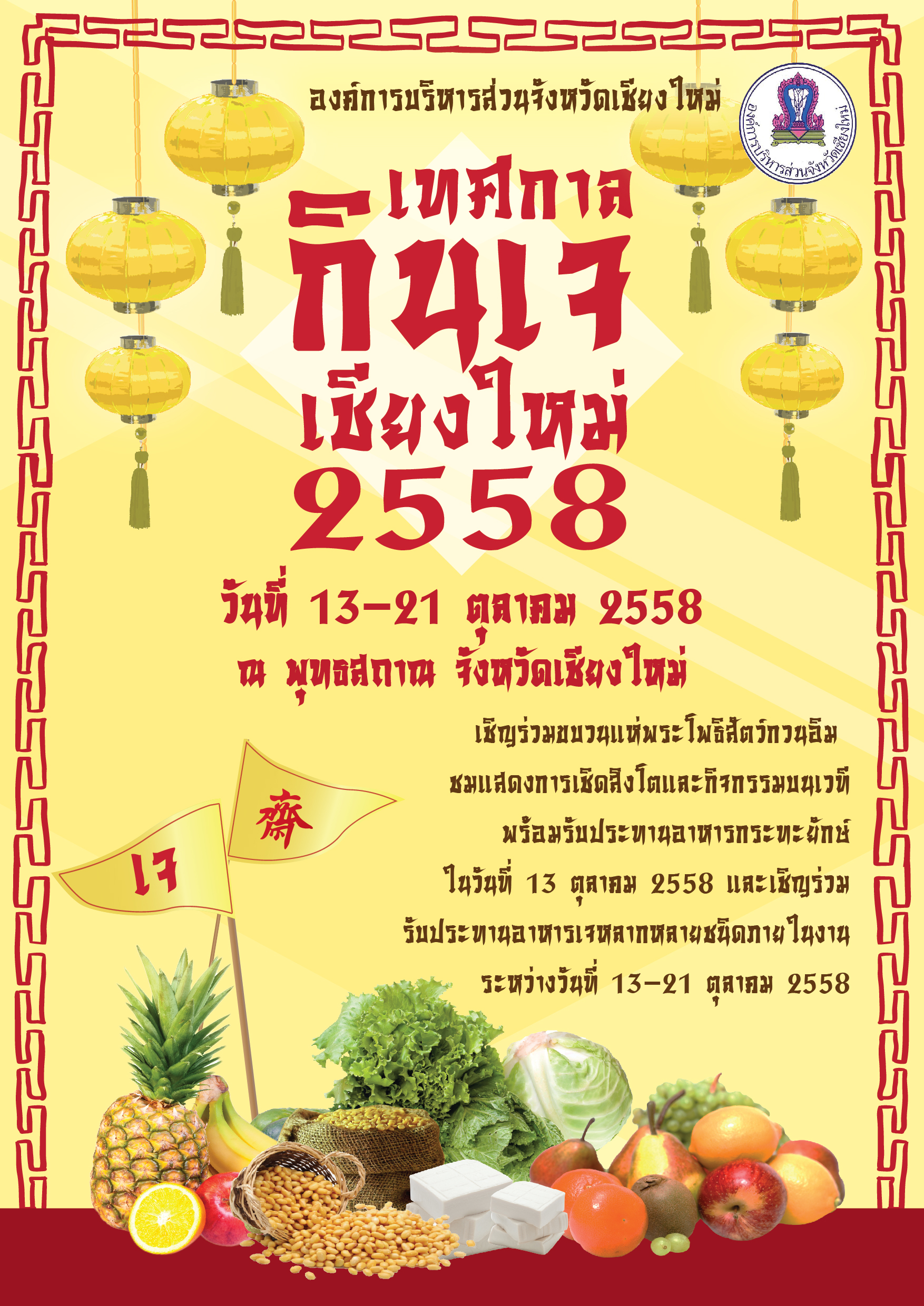 องค์การบริหารส่วนจังหวัดเชียงใหม่ จัดเทศกาลกินเจ เดือนเก้า ประจำปี 2558 ระหว่างวันที่ 13 - 21 ต.ค.58 ณ พุทธสถานจังหวัดเชียงใ...