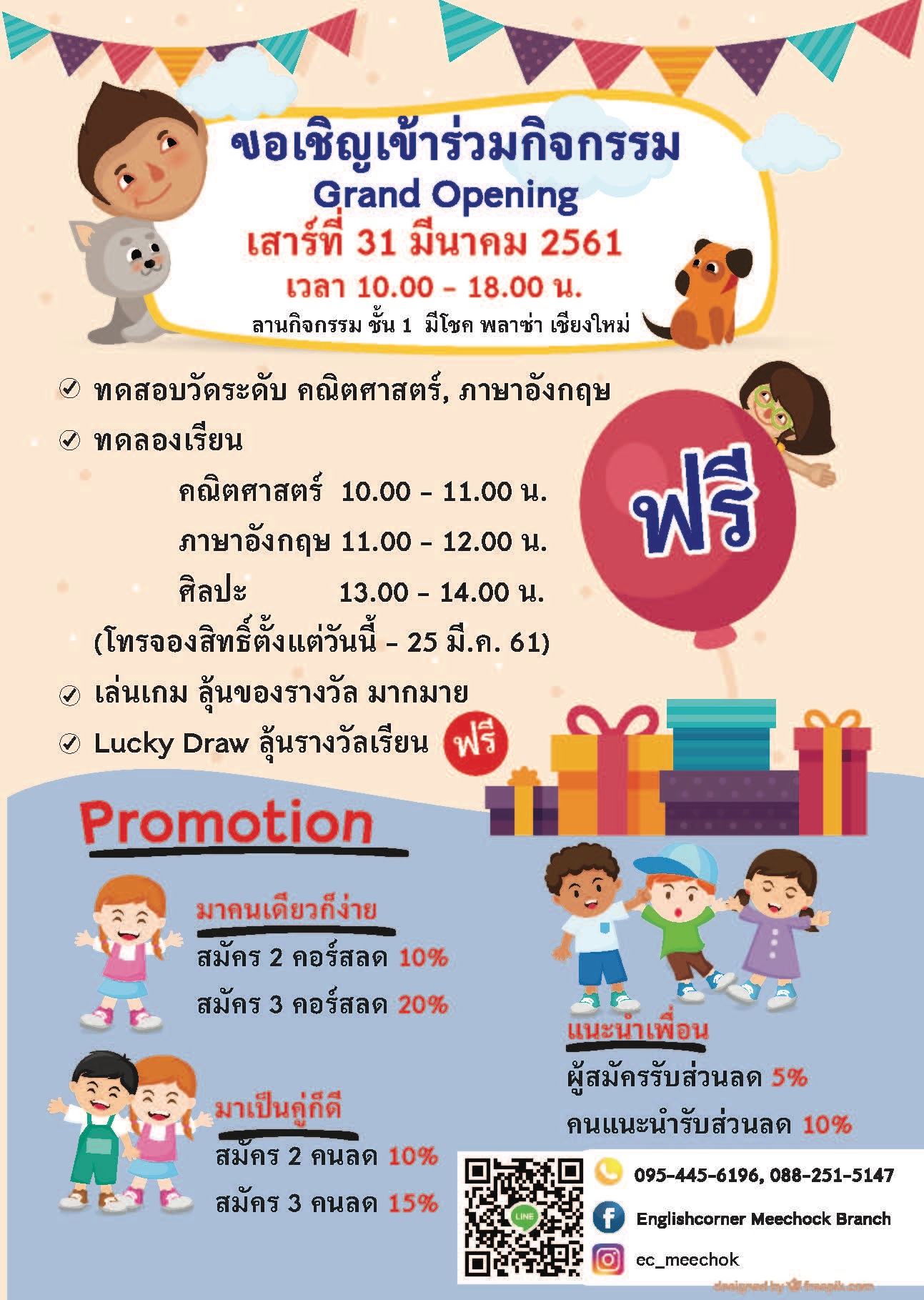 ขอเชิญเข้าร่วมกิจกรรม Grand Opening English Corner สาขามีโชคพลาซ่า ในวันเสาร์ ที่ 31 มี.ค.61 เวลา 10.00-18.00 น. ณ ลานกิจกรรม ชั้น...